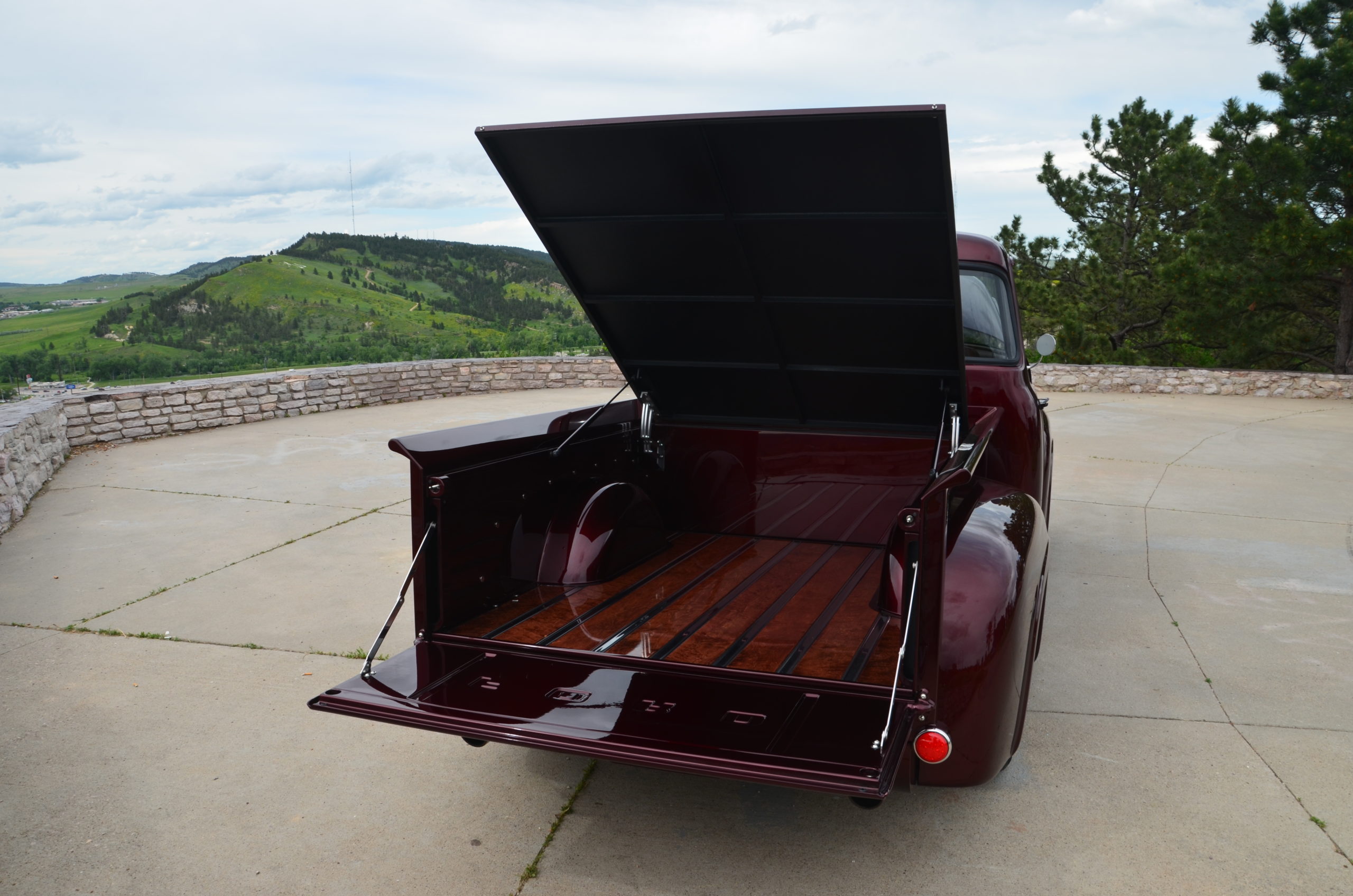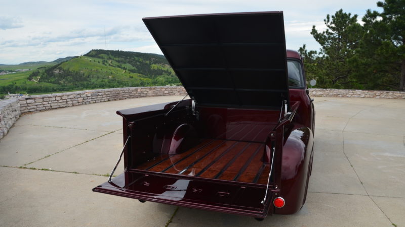 Back to the bed area, we install a pair of small wheel tubs to allow for larger rear wheel tire combination. Of course, that affects the bed wood and stainless strips. The bed wood turned out nice, it’s Birdseye maple. We sanded it very smooth several time, then experimented with the right color stain until we were happy. The wood was stained and clear coated with the same clear we used on the outside paint. We fabricated a box in the front of the bed to house the fuel tank and battery. The fuel tank was fabricated out of .080 Aluminum using a GM fuel pump. While we were in there, we fab up a box to house the Optima red top battery. Because where the battery was hid, we made sure to install some jump post and a power shut off switch. Then a steel cover was fabricated to cover the tank and about the front 12 inches of the bed. We used a Hagen fuel tank door, so the truck is very easy to fill the 16-gallon tank. Marks plan for the truck is take it on the road and drive it. So, we decide to make him a custom-made Aluminum tonneau cover, using aluminum square tubing and .063 aluminum sheet. We went to Sachse Rod Shop in TX for the Tonneau cover hinges and support struts.