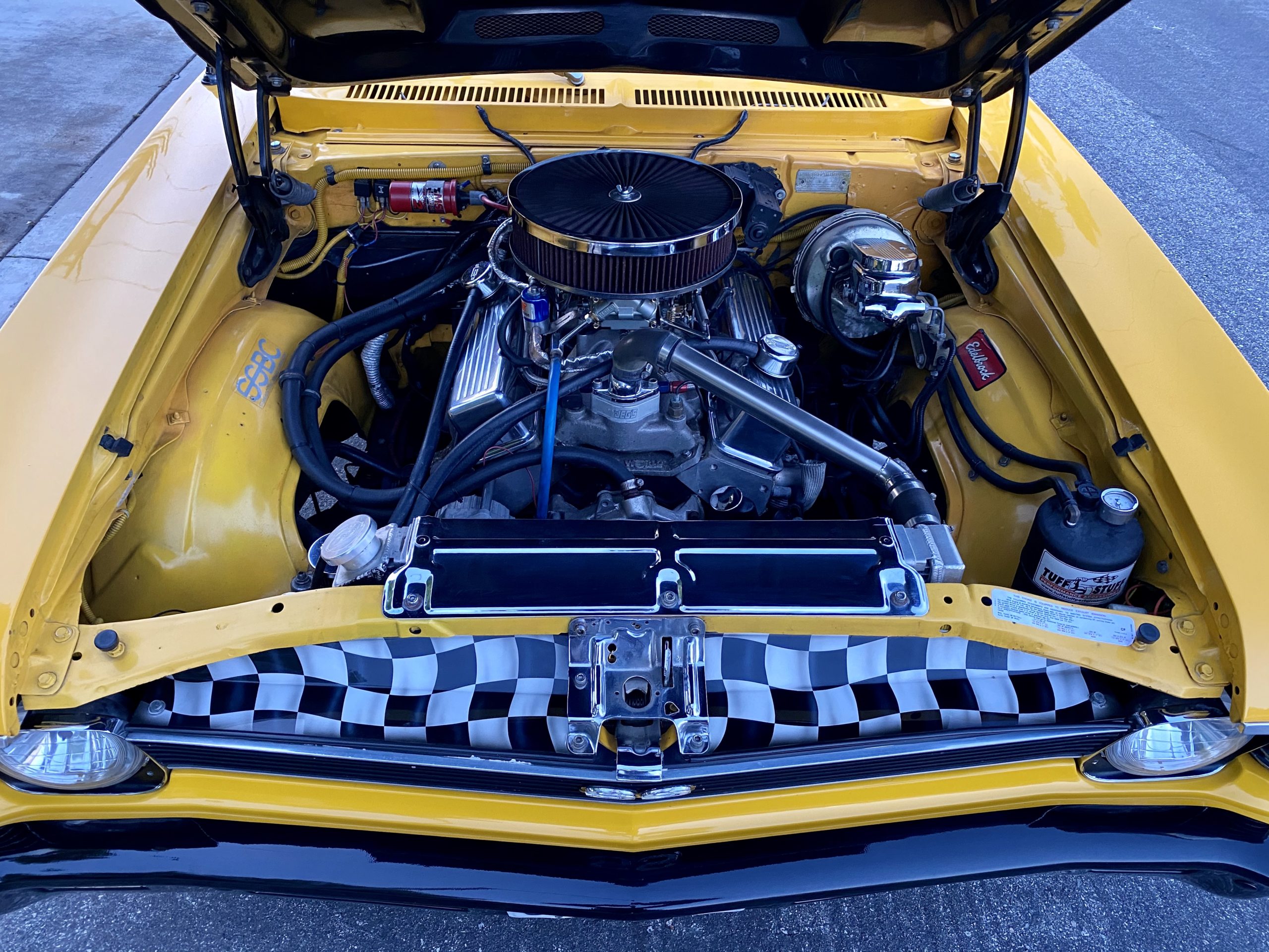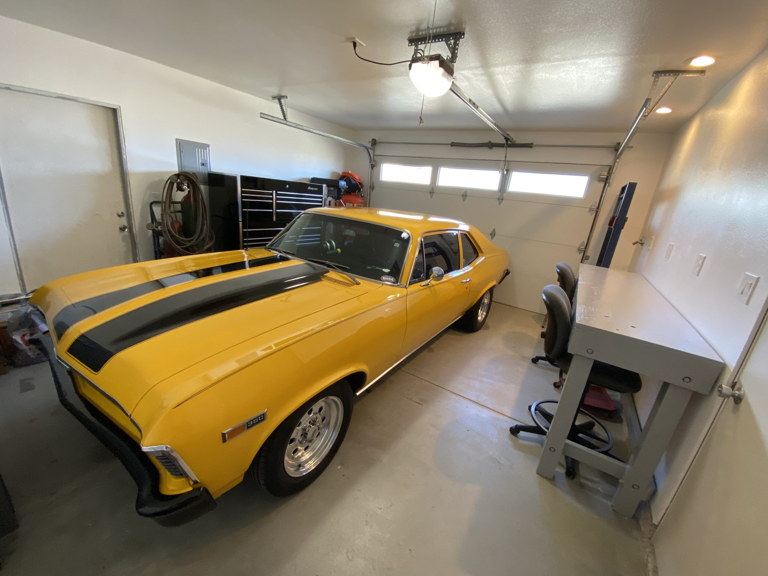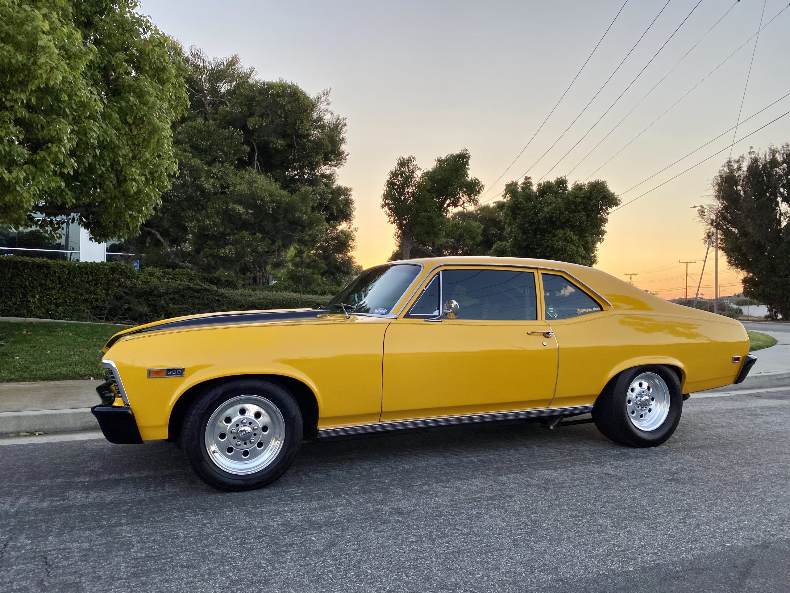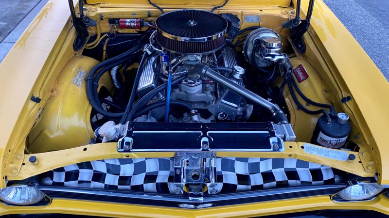 Grandpa (Papa) Dennis put together a good running 1969 Nova to take to the local cruise spots in southern California. He built a reliable street car with some go fast goodies. Dennis built the 383 cubic inch small block Chevy with White Performance aluminum heads, comp cam, MSD billet distributer, World Products Motown intake manifold topped off with a SMI prepared Holley 750 double pumper. To squeeze even more ponies out of it, he added a Holley Nitrous Oxide Systems kit. The power is connected to a modified GM TH350, out back is a 9” Currie rear end with 3:70 gears and True Trac. For traction Cal Trac bars were installed along with Moroso subframe connectors. A pair of Mickey Thompson ET Street 27 x 10.50 -15LT tires put the power to the ground.