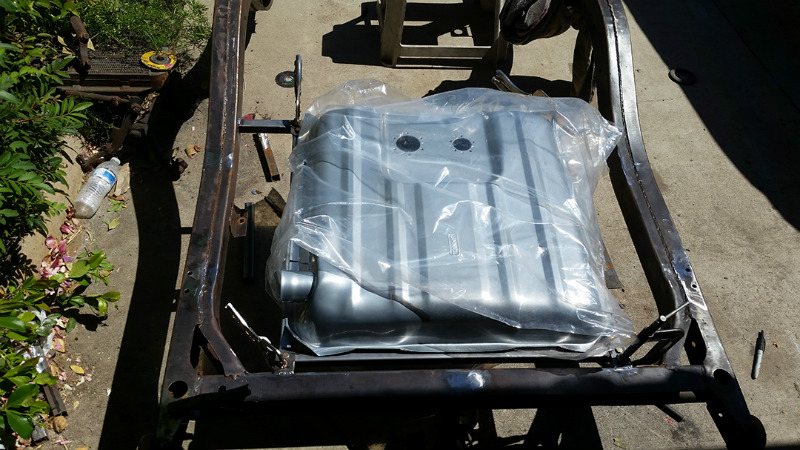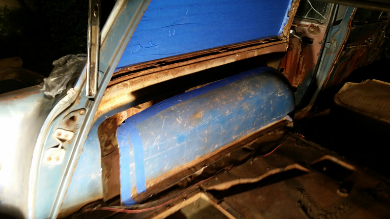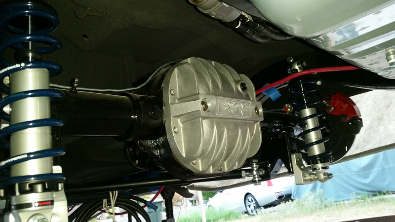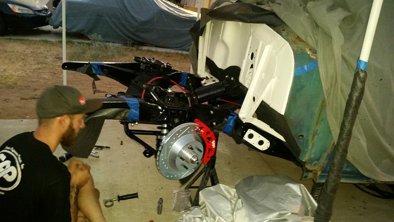 Denver Lawrence, web designer, the person writing this page. After searching through Craigs List the perfect project popped up. I responded right away, and the seller said she only posted a minute ago. I knew it was a good buy. Gathered up some friends to get some wheels on it to tow it back home. SEMA being 9 months away and only working in the driveway, got started ripping the old stuff out. After tearing out the old interior, I discovered that the car was mostly solid. Only one panel on the driver side needed to be replaced. It was a challenge to keep the body up in the air so he could snake the frame from underneath to clean it up. Once that issue was solved, a larger set of wheel tubs was installed in the rear floor pan, under which a modified shortened Ford Explorer 8.8-inch rear-end housing was set into place. This solved the issue of adding disc brakes to the car.