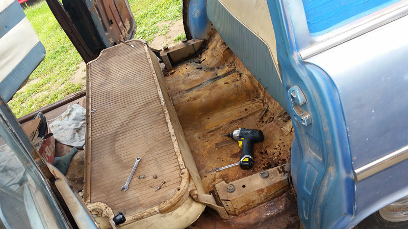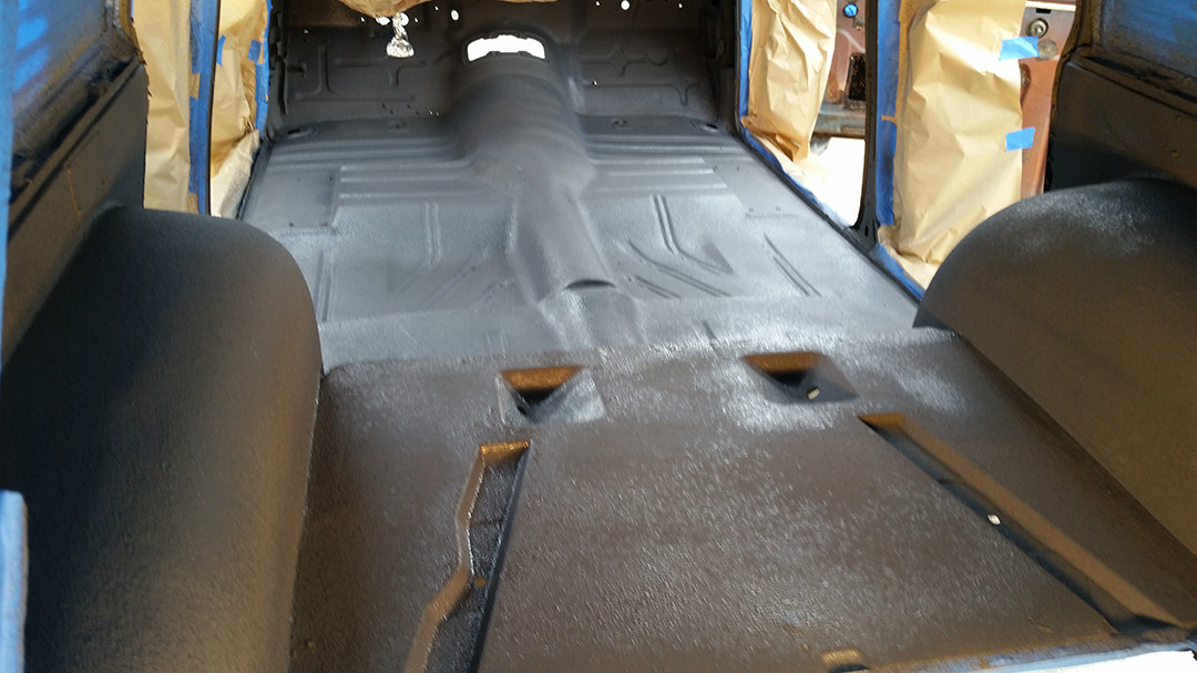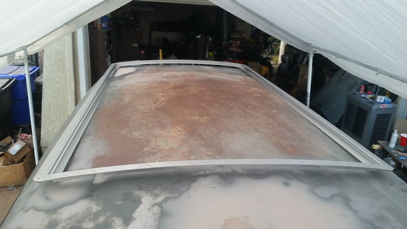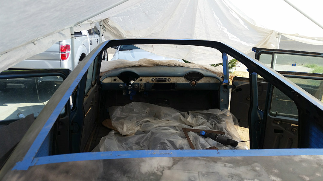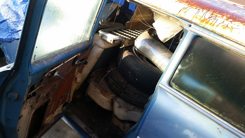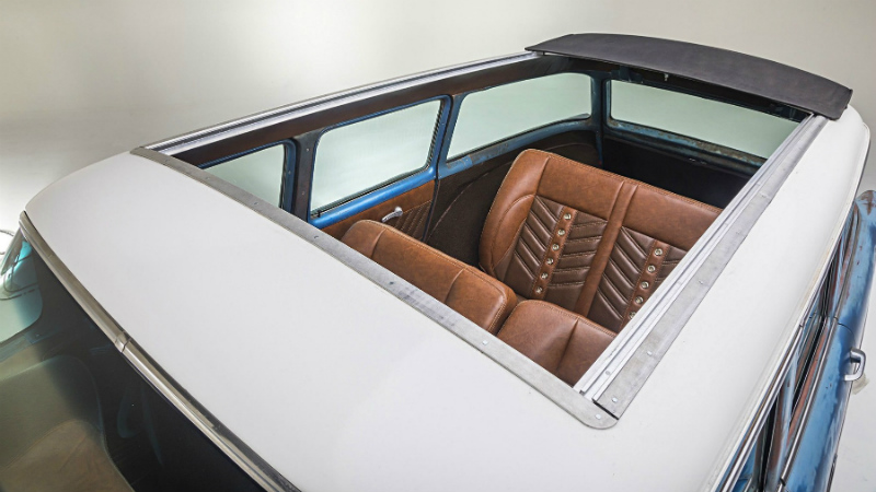 Larry and I were debating what to do with the long, rusted roof. It was in good condition, just needed to be sanded down a lot, and that’s where the idea for a rag top came into play. I hit up Legacy Products for a custom 48x80-inch sliding rag top and prepped myself to cut a huge hole with a Sawzall. We think this simple modification helped the wagon to stand out amongst the crowd at SEMA.