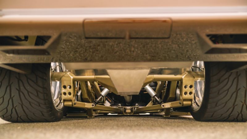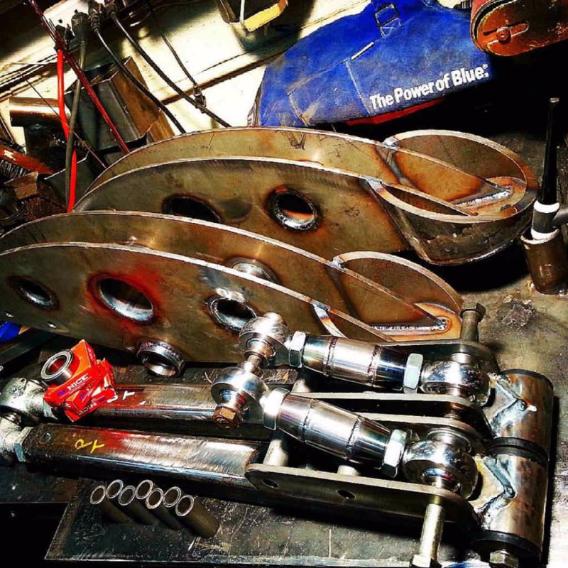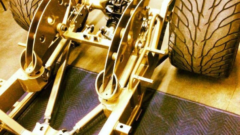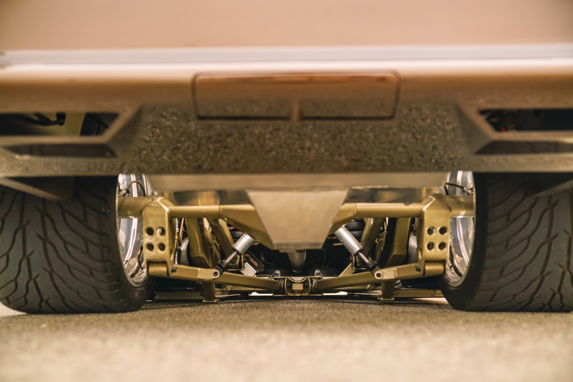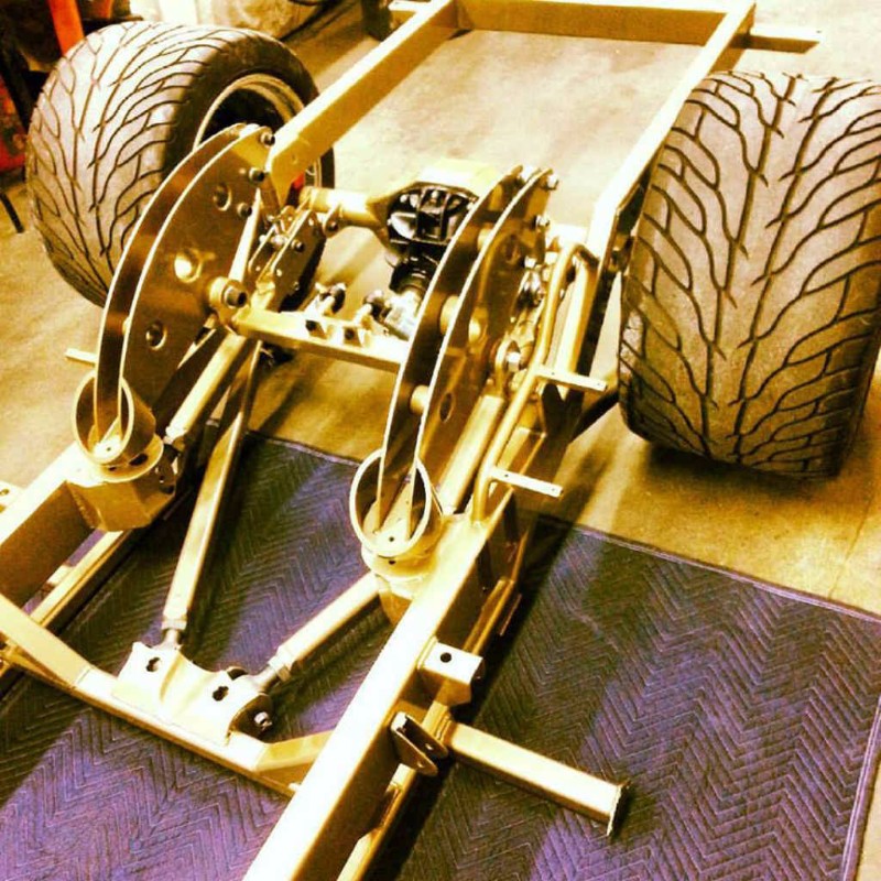 - Rear suspension is a custom fabricated upside down triangulated 4 link w/adjustable weight distribution cantilevered system, fox shocks w/dimple dyed brackets, Currie F9 rear end, boxed and Z framed, 14” Wilwood brakes, 20 x 15” Boyd’s HRBB wheels wrapped in Mickey Thompson AR sportsman radials.