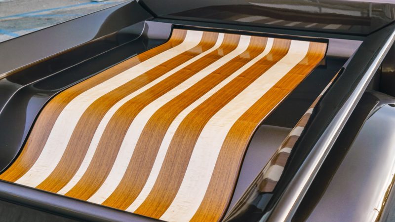 - Custom bed with smooth sides and rolling stained pressed mahogany wood that flows from the front portion of the bed as seen in old wooden architecture. The bed rises with actuatures and showcases the powder coated frame and brushed metals along with a hidden rear floating suspended air system. The machined and laser cut components are neatly tucked underneath the richly hand crafted pressed wooden bed floor.