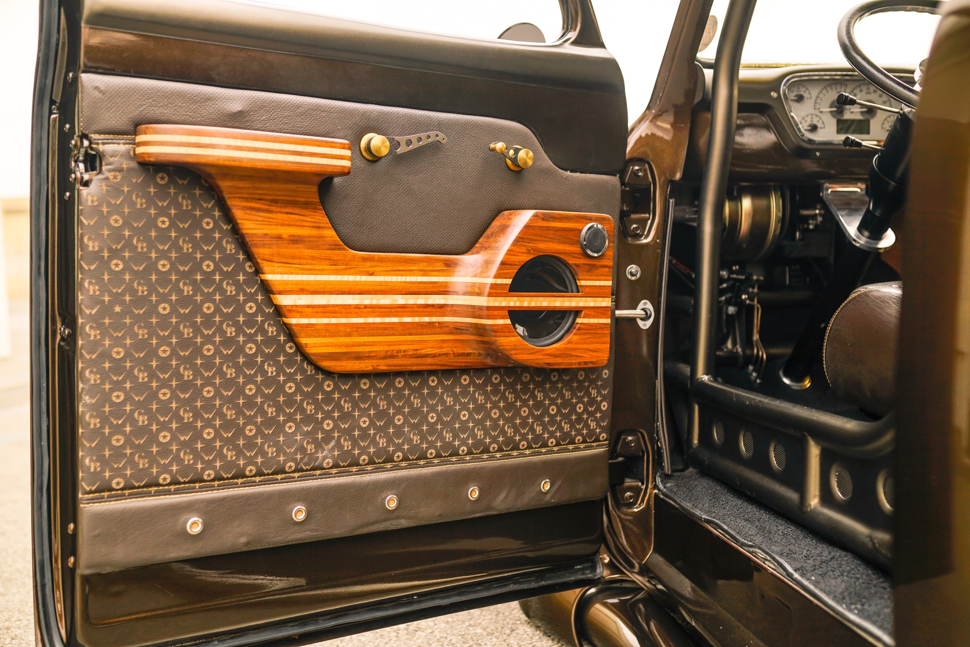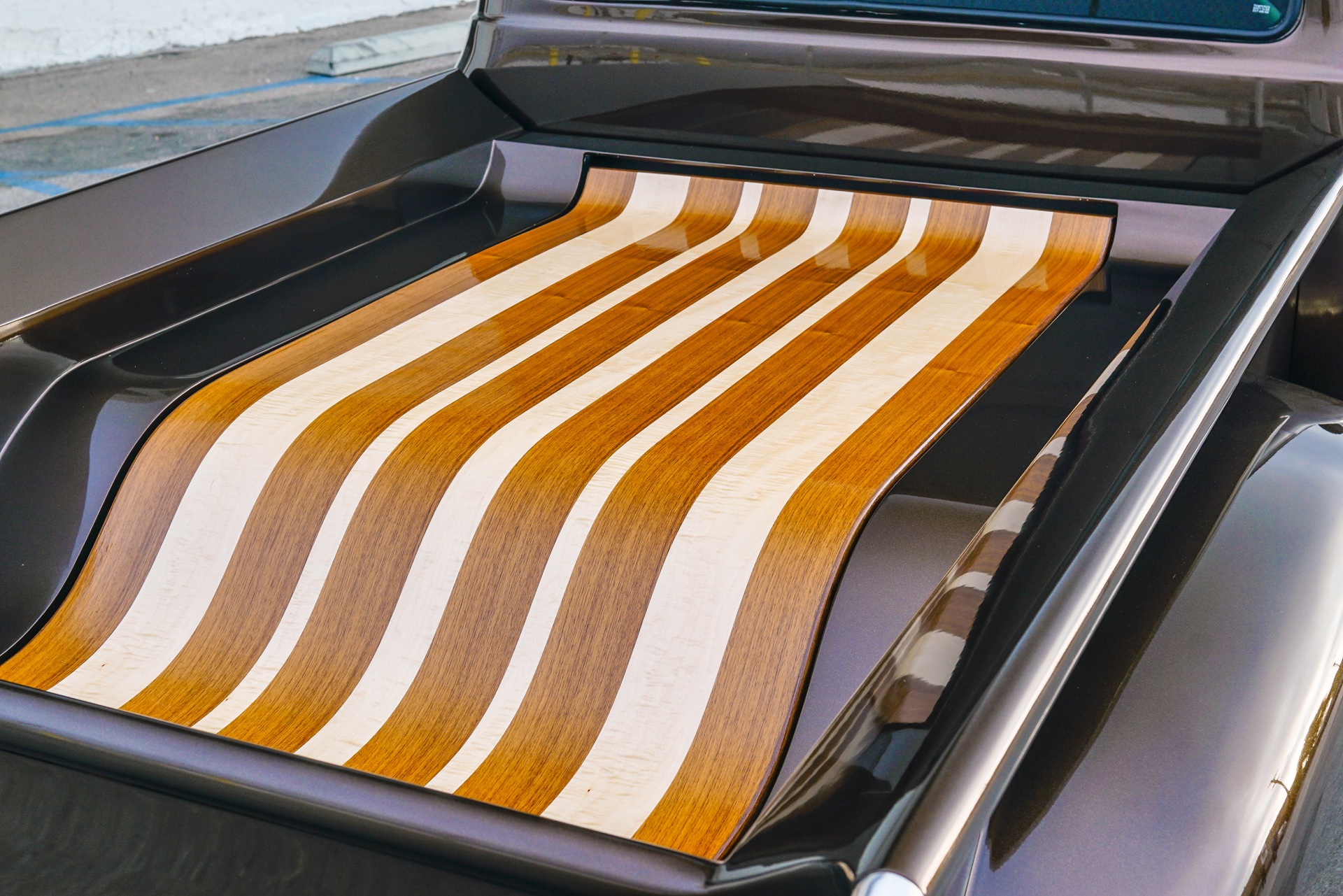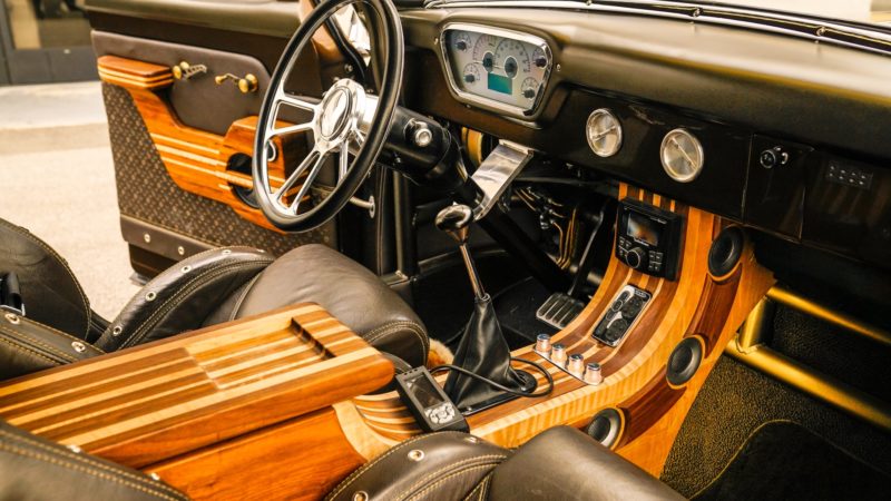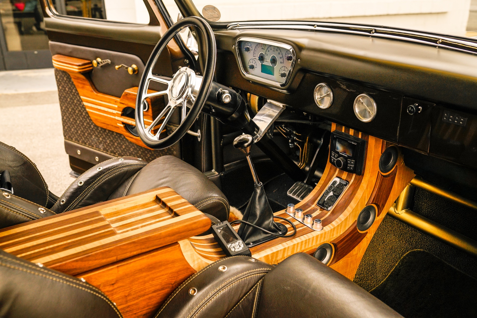 - Interior showcases a theme oriented luxuriously upholstered cab along with a custom hand crafted mahogany center console and Restomod styled gauge cluster.