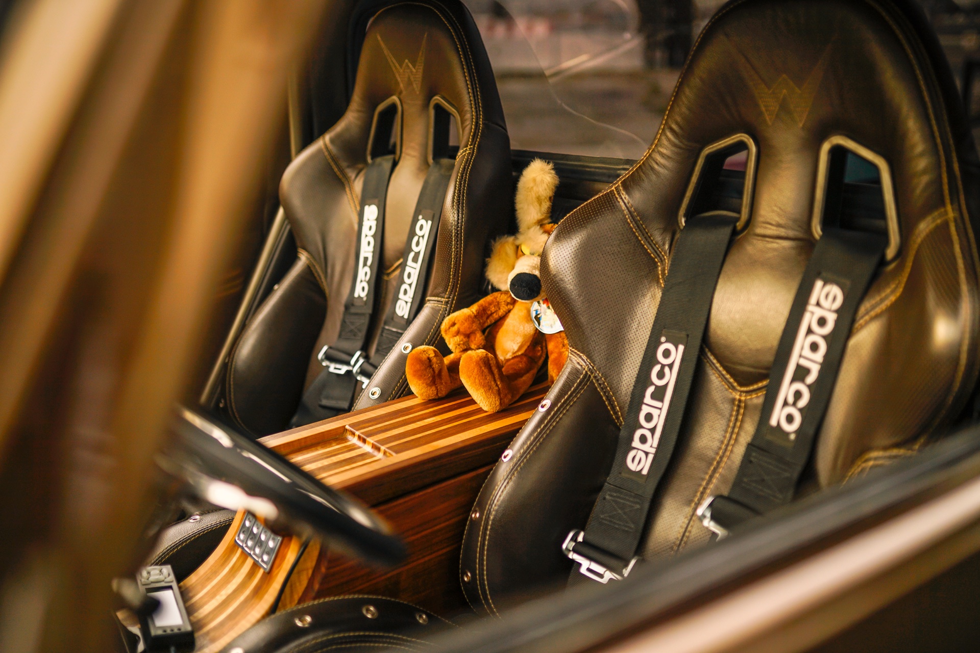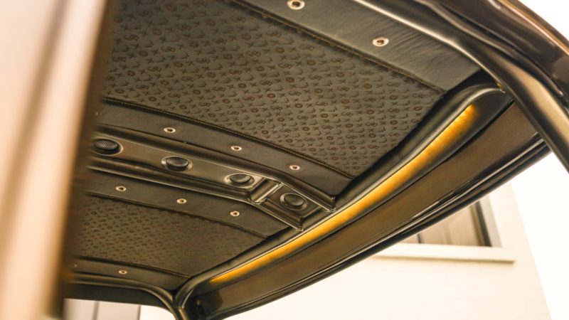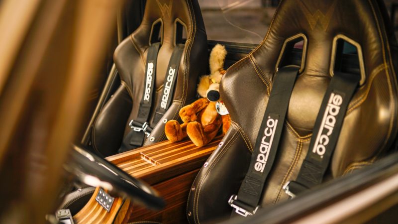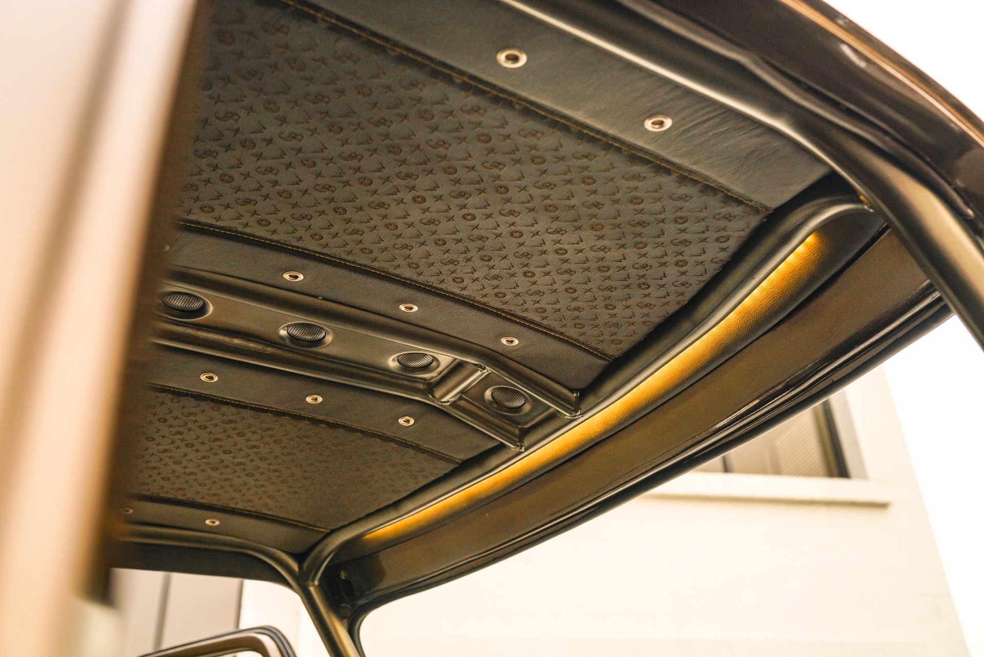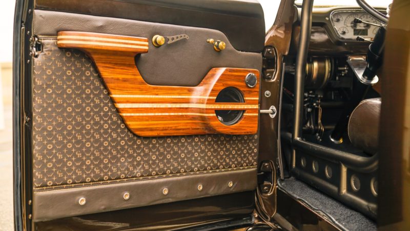 - Interior showcases a theme oriented luxuriously upholstered cab along with a custom hand crafted mahogany center console and Restomod styled gauge cluster.