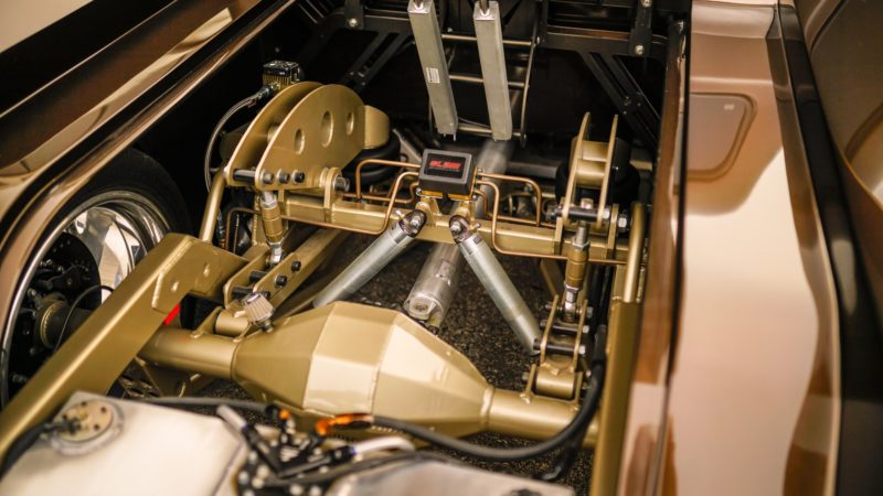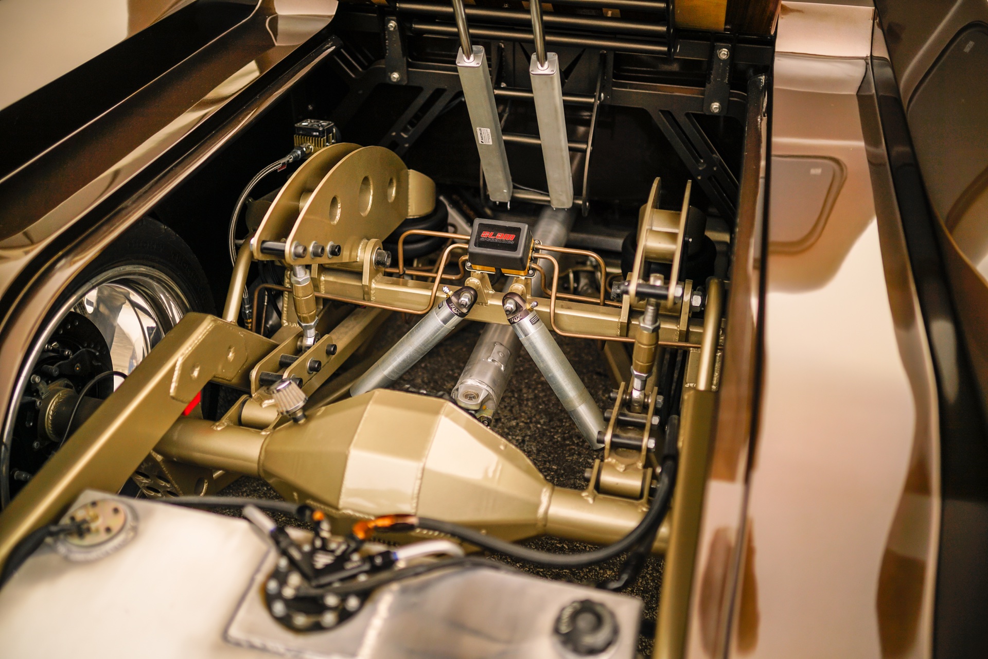 - Front suspension includes a TCI front mustang 2 clip, slam specialty bags w/Accuair ride control, and viair dual compressors, fox shocks w/custom dimple dyed top shock brackets, 14 Wilwood brakes, 20 x 8.5” Boyd’s HRBB wheels wrapped in 245/35/20 Nitto extreme ZR radials.