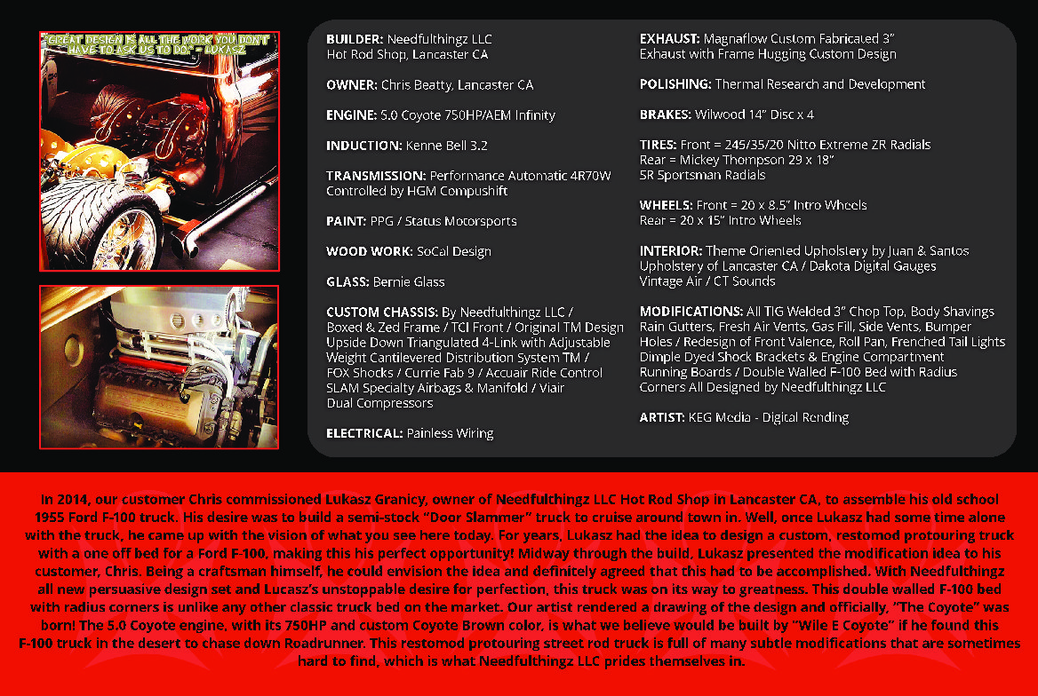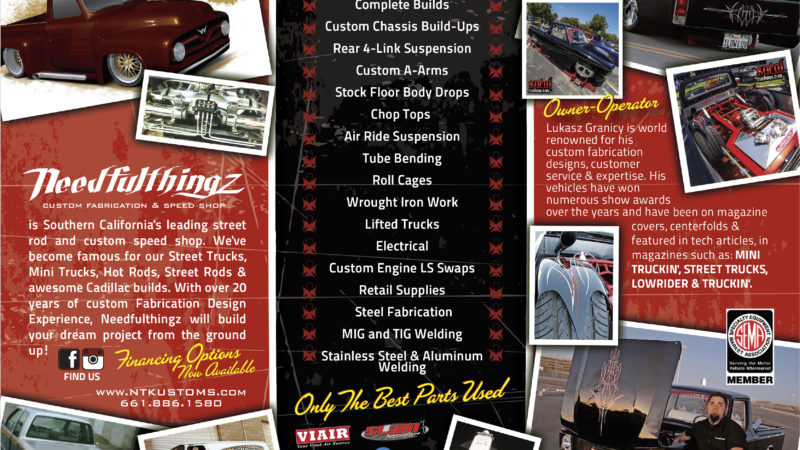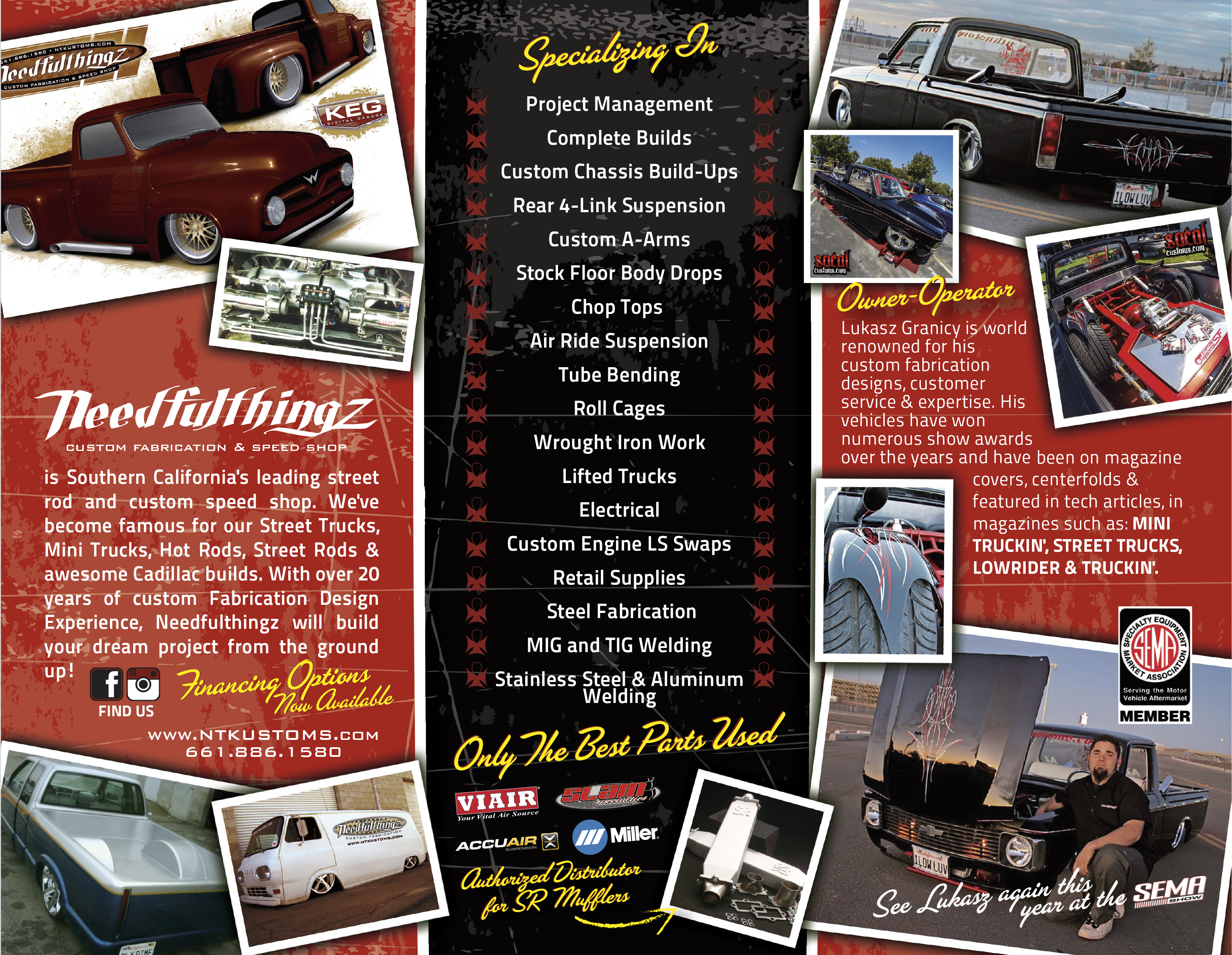 Needfulthingz Hot Rod & Fabrication Shop founder is Lukasz Granicy. The company was founded in 2000 and located in his home town of Lancaster, California. Hot Rods flow through Lukasz's veins since building amazing cars and trucks has been a Family Tradition since 1961. Through long hours and dedication, Needfulthingz L.L.C. has become one of Southern California's leading Hot Rod, Design and Speed Shops, specializing in complete builds from the ground up. Creativity, expertise and outstanding customer service has earned Needfulthingz Hot Rod Shop an amazing reputation. Needfulthingz vehicles have earned numerous awards throughout the years and have been featured on magazine covers, centerfolds, commericals, digital publications and in tech articles in STREET TRUCKS, TRUCKIN', MINI TRUCKIN and LOWRIDER. Lukasz Granicy is a SEMA member and a frequent contestant in the Battle of the Builder contest in Las Vegas at the SEMA Show. Needfulthingz is known to design innovative creations, hand built right....the old fashioned way!
